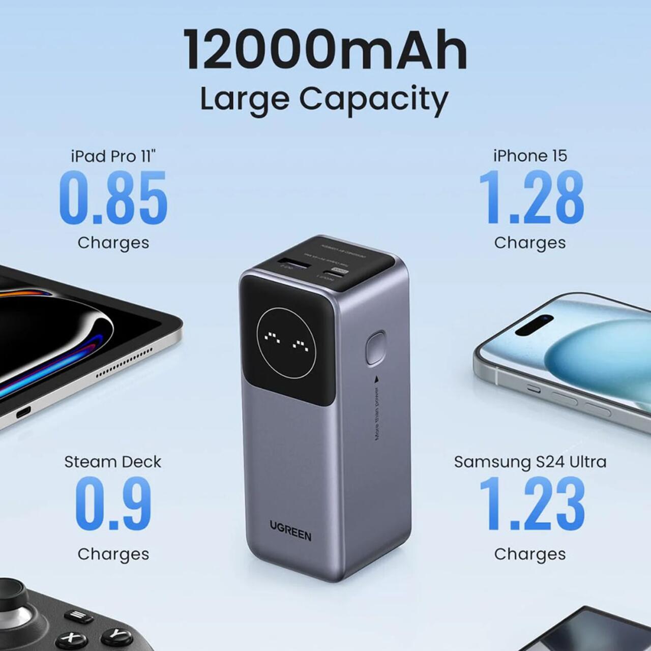 Acumulator extern 12000mAh de la Ugreen, este conceput pentru utilizatorii care au nevoie de putere mare intr-un format compact. Cu o capacitate de 12.000 mAh, acesta ofera 1–2 incarcari complete pentru smartphone-uri si tablete si poate alimenta inclusiv laptopuri compatibile USB-C.
