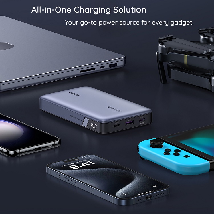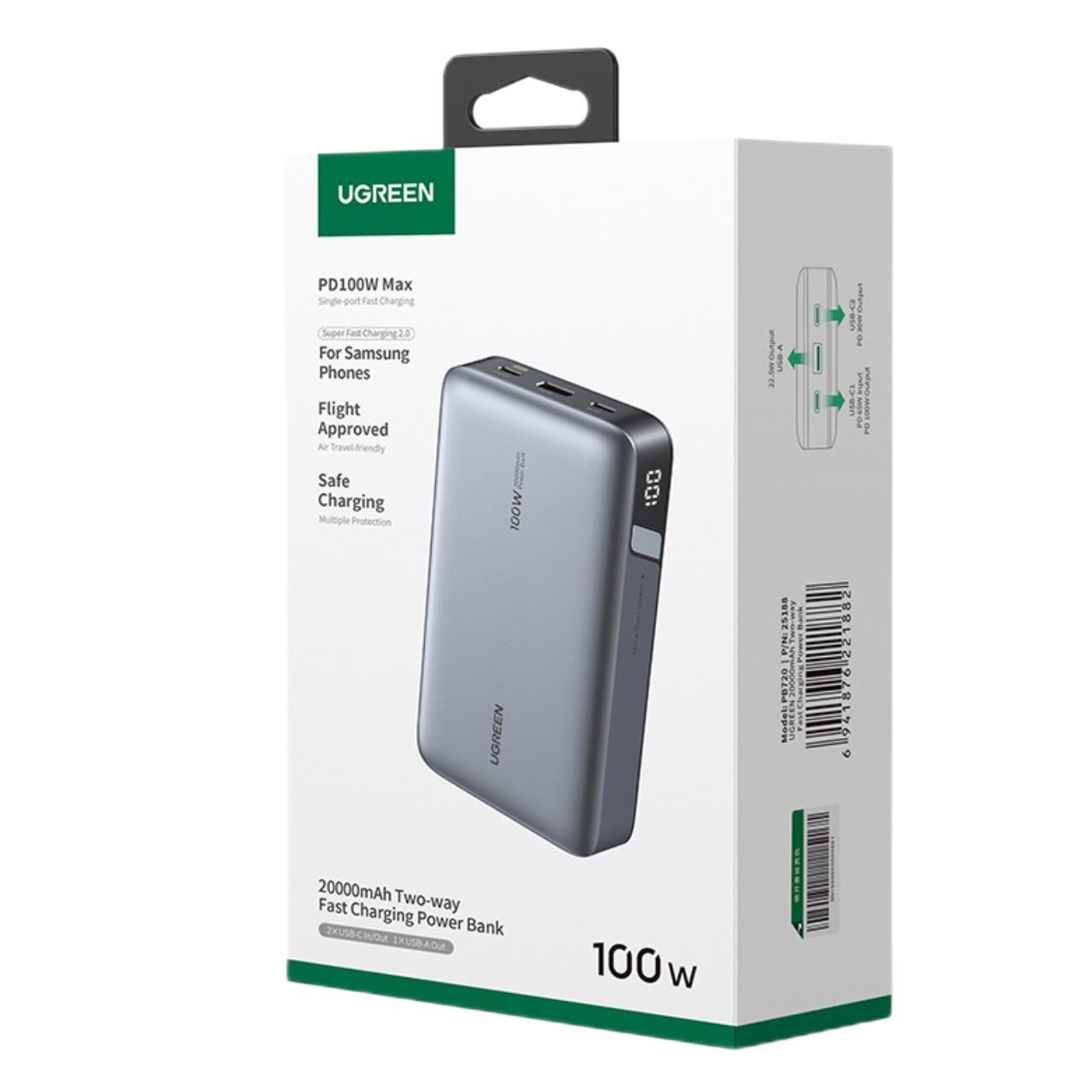 Acumulatorul extern 20000mAh, 100W de la Ugreen, este un power bank performant, destinat utilizatorilor care au nevoie de energie mare intr-un format portabil. Cu o capacitate de 20.000 mAh si suport pentru incarcare rapida de 100W, poate alimenta eficient smartphone-uri, tablete si laptopuri compatibile USB-C.