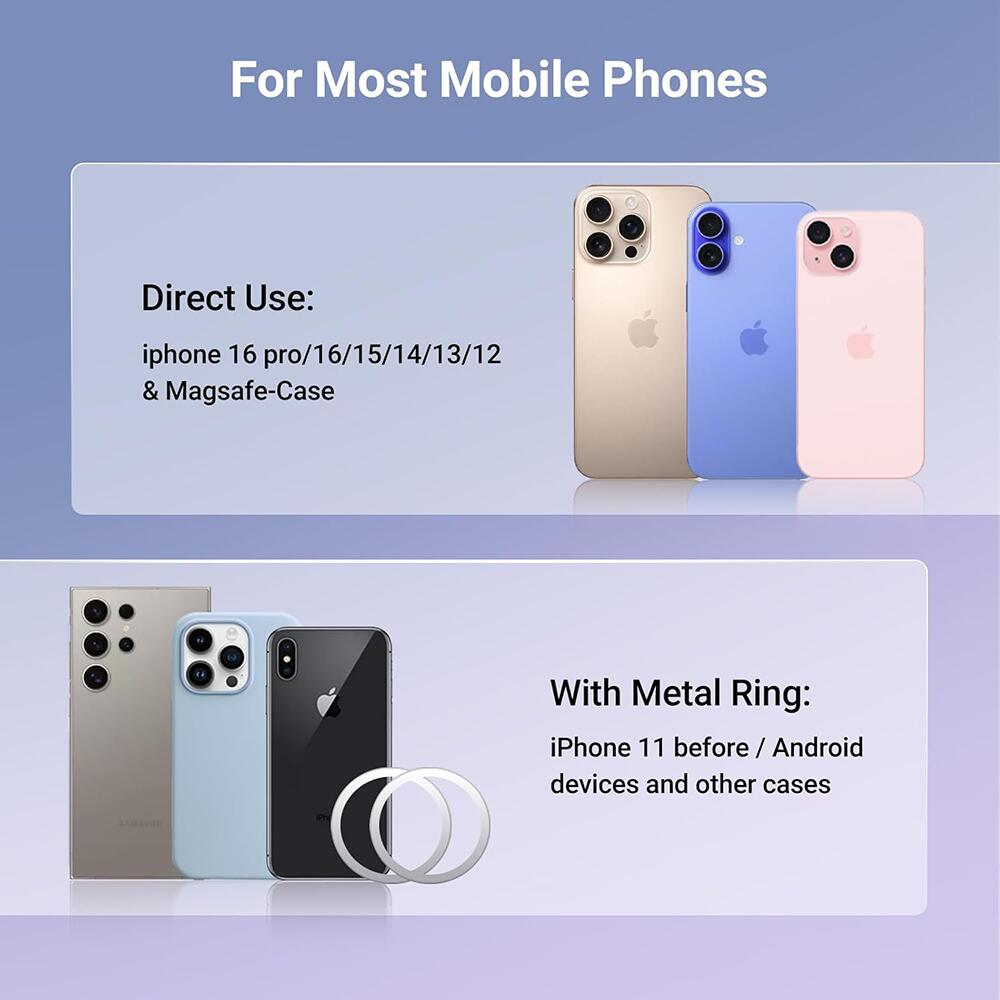 Suportul colaboreaza direct cu iPhone-urile 12, 13, 14, 15 si 16, precum si cu husele originale MagSafe. Pentru modelele mai vechi si alte smartphone-uri, inclusiv dispozitive cu Android, este suficient sa folosesti un inel care asigura compatibilitatea cu sistemul magnetic.