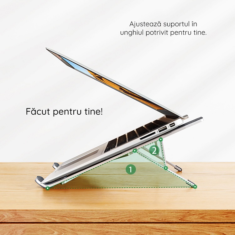 Design Ergonomic Ajustabil: Permite reglarea unghiului de vizualizare pentru a preveni oboseala gatului si a spatelui. Iti ridica laptopul la nivelul ochilor, imbunatatind postura instantaneu.